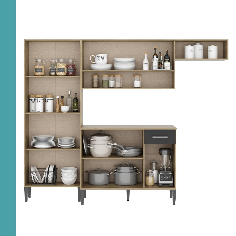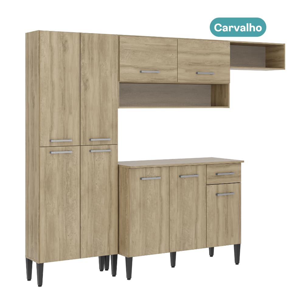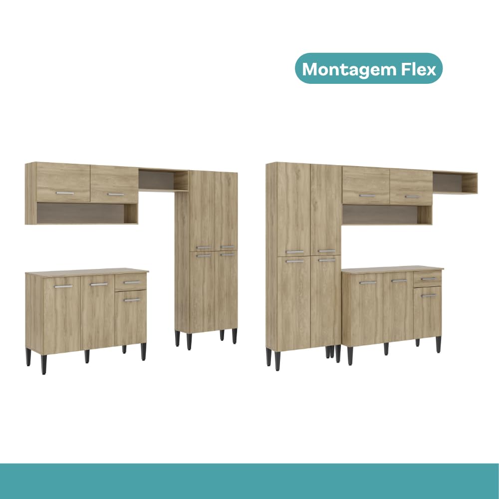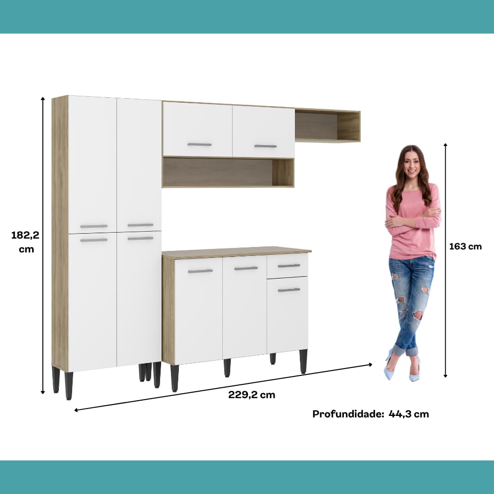 - Composta por paneleiro com 4 portas, balcão de pia com gaveteiro, armário aéreo e nicho.
