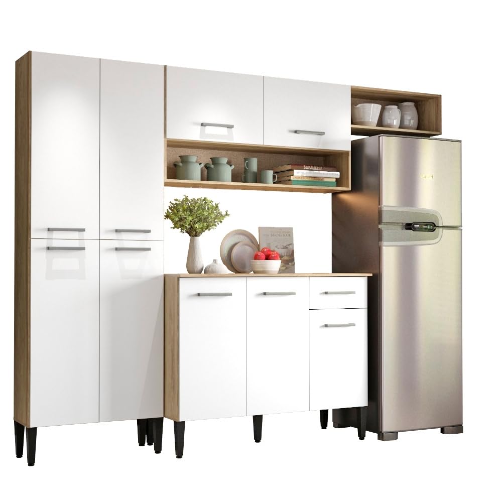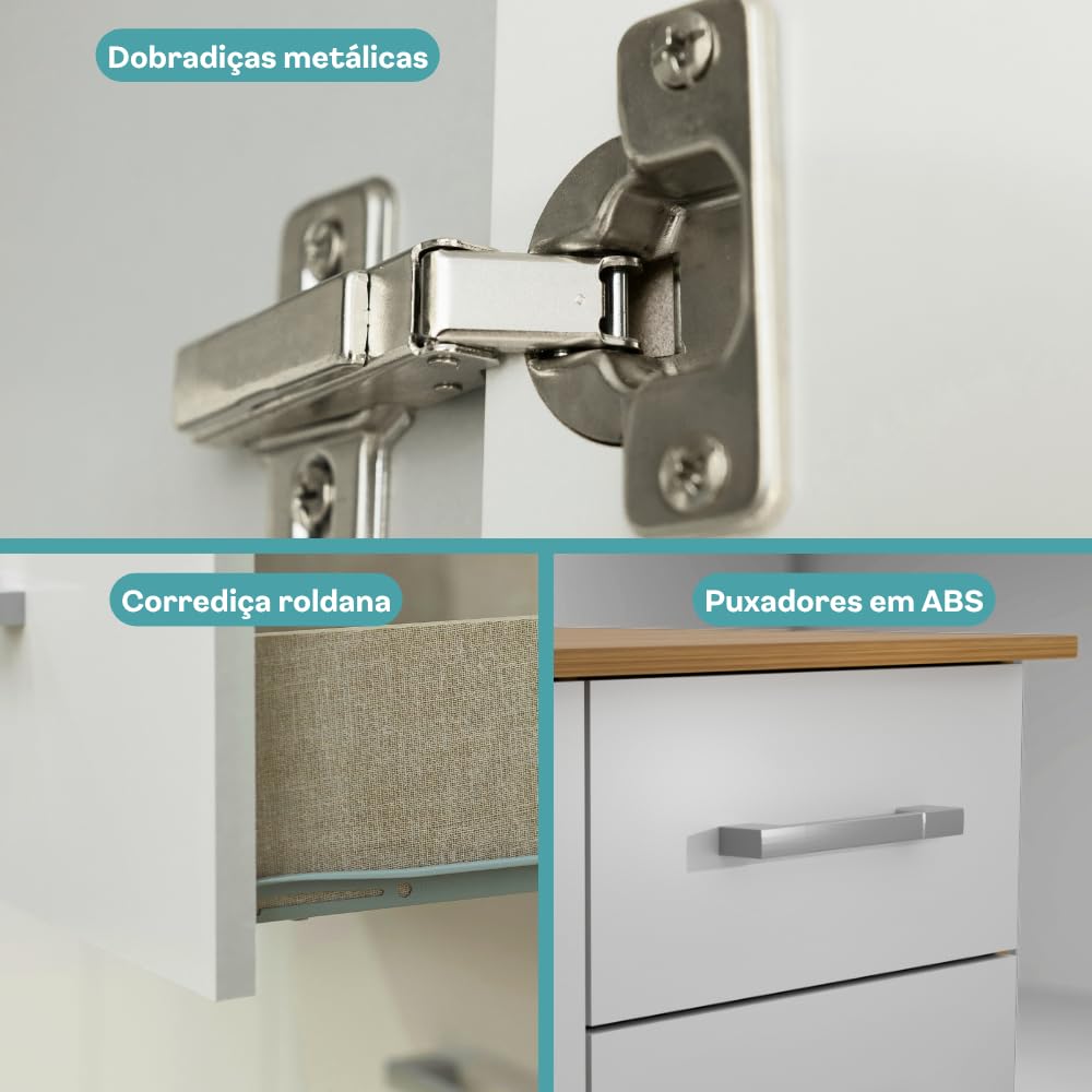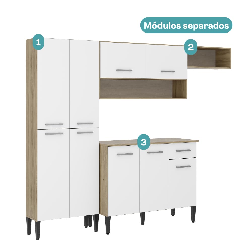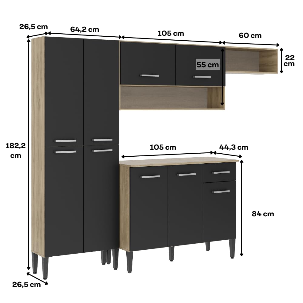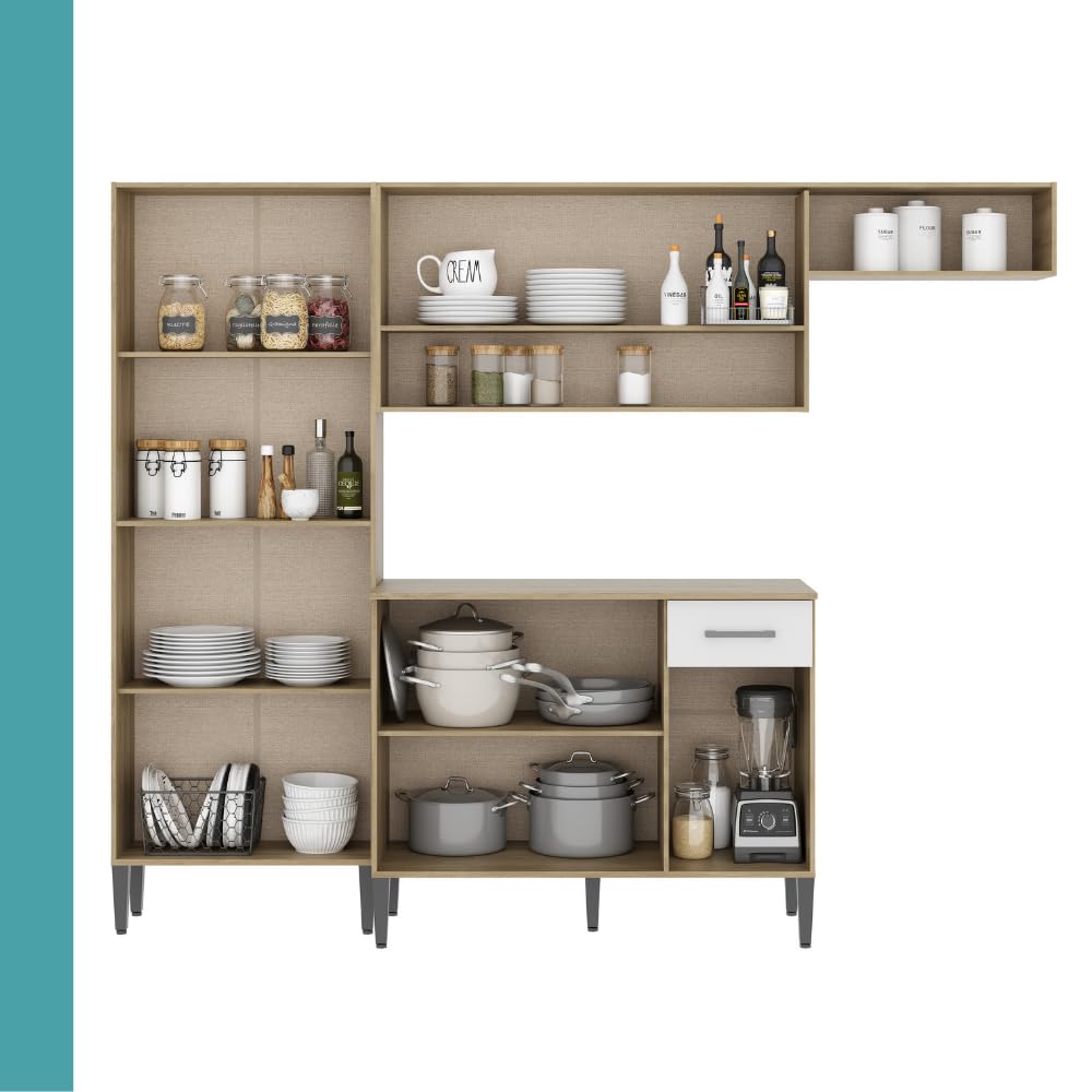 - Composta por paneleiro com 4 portas, balcão de pia com gaveteiro, armário aéreo e nicho.