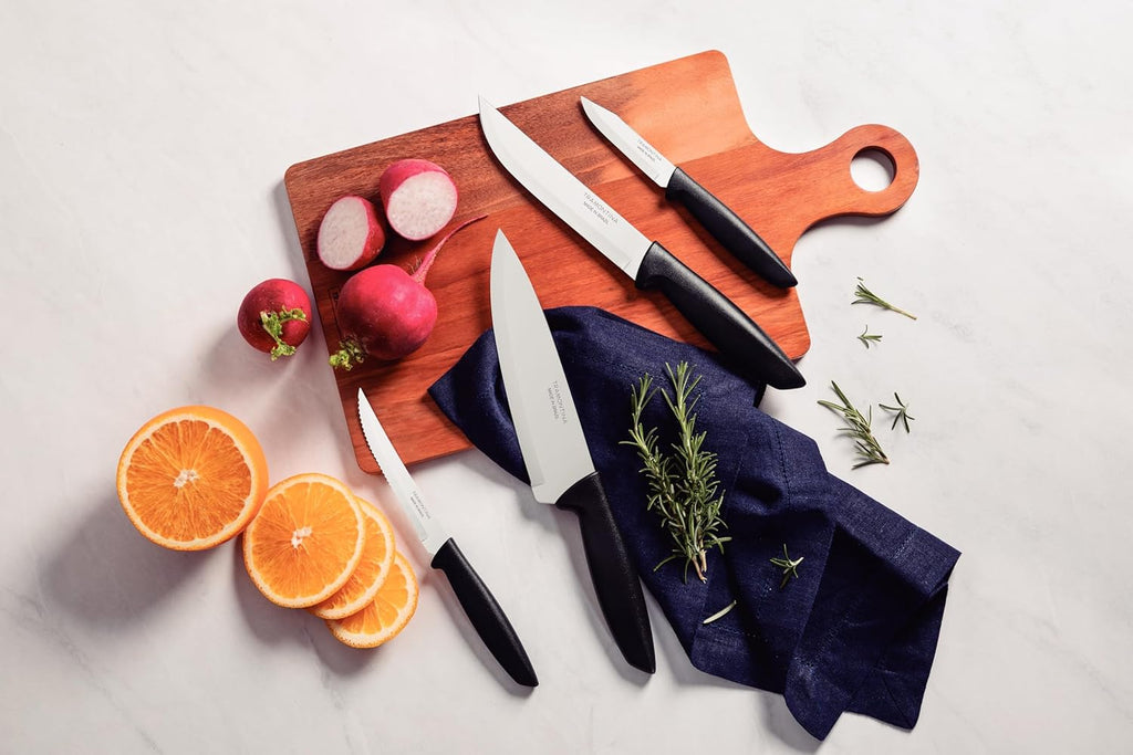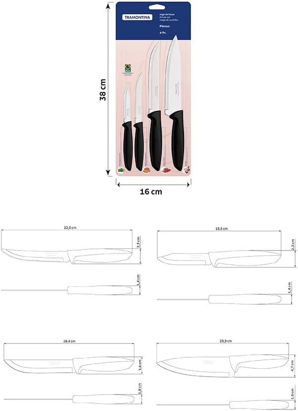 • Jogo de Facas Tramontina Plenus com Lâminas em Aço Inox e Cabos de Polipropileno Preto 04 Peças